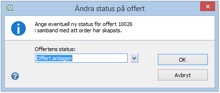 Vid kopiering av en offert till ny order kan en ny status också direkt sättas på offerten. I de fall statustexter har definierats i Statustexter för offerter, kommer då också dialogen Ändra status på offert att erbjuda en ändring av offertens status.