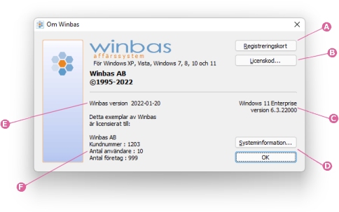 Om Winbas återfinns under Hjälpmenyn (?) på menyraden. Här finns bl.a. uppgifter om nuvarande version och annan information om Winbas.