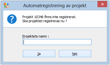 Om ett projekt vars nummer inte finns registrerat anges, ges en fråga om projektet ska registreras automatiskt som ett nytt projekt i Projekt.