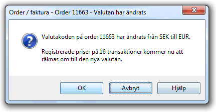 Dialogen visas när inställningen Valutaomräkning utpris SEK vid försäljning används och en befintlig order förändras med avseende på valutakod. Dialogen indikerar att priser på rader som tidigare har registrerats på ordern kommer att räknas om till den nya valutan.