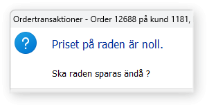Om inställningen Levererat antal sätts till Beställt antal inte är aktiverad kommer varningen istället att ta hänsyn till radens pris, då oavsett om det levererade antalet är noll. Detta för att slippa varningen i de fall ordern initialt enbart registreras med beställt antal och levererat antal fylls på i ett senare skede.