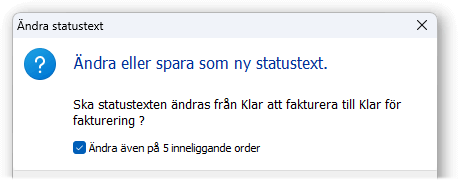 Ändra statustext. Vid registrering av statustexter kan en text ändras eller sparas som en ny statustext. I detta fall visas dialogen Ändra statustext för att göra en ändring av texten istället för att skapa en ny kopia. Dialogen ger också möjlighet att ändra status till den nya texten i de inneliggande order där den förekommer.