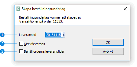 I dialogrutan Skapa beställningsunderlag finns också alternativet Direktleverans. Alternativet Direktleverans innebär att leveransadress som är angiven på order kommer att registreras som leveransadress på beställning, d.v.s. leverans av produkter görs direkt till kund.