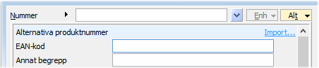 Import av alternativa produktnummer från fil kan utföras direkt från produktkortet. För att använda importfunktionen för inläsning av från fil skapad i t.ex. Excel, öppna listan med alternativa nummer välj därefter importen till höger i rubriken.