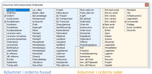 Förutom beställningsnummer, leverantör (eget företag eller legotillverkare) och produkten av strukturantalet kan kolumner från beställningen, transaktionen och själva strukturraden väljas in i listan. Exempelvis kan Produktnr väljas in och visar då vilken Huvudprodukt detaljen är registrerad på i beställningen.