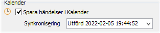 Om alternativen Spara händelser i kalender är inställda i inställningar för Outlook sker en synkronisering även från Outlook till Säljstöd. Synkroniseringsfunktionen kontrollerar om det finns kalenderhändelser i Säljstöd som inte registrerats i Outlook, t.ex. om en annan användare har registrerat på den egna kalendern. Funktionen kontrollerar även om det finns objekt som har lagts till eller förändrats sedan i Outlook sedan förra kontrollen utfördes. Noggrannheten för denna kontroll är baserad på datum och tid, vilket innebär att alla objekt från och med förra synkroniseringsdatum och tid kommer att bearbetas.