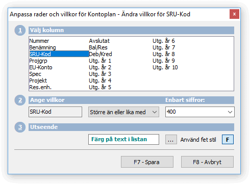 Ange därefter vilket värde kolumnen ska jämföras mot. Beroende på vilken typ av data som lagras i kolumnen kan olika värden anges. Om t.ex. datatypen motsvarar ett Ja/Nej-fält, ska enbart Ja eller Nej anges, eller om kolumnen innehåller ett belopp, ska en siffra anges. Rubriken ovanför värdet anger vilken typ som kan anges beroende på vilken kolumn som har valts.