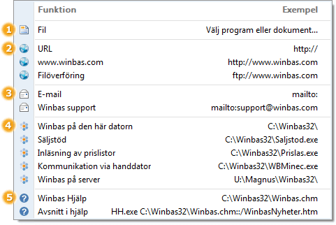 Genvägar kan skapas till olika rutiner i Winbas beroende på vilka rättigheter man har och genom att bläddra i trädstrukturen kan den aktuella funktionen väljas. Den ikon som representerar funktionen visas då tillsammans med det föreslagna namnet som också är själva funktionen namn.