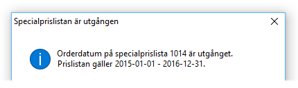 Om Signal vid order om datum utgånget används, kommer inte prislistan att användas när orderdatum eller leveranstid är utanför det angivna intervallet, istället ges information om att prislistan är utgången.