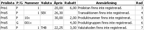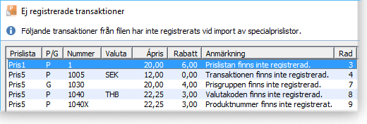 Om en fil innehåller fält som t.ex. refererar till en ej registrerad specialprislista eller till en produkt som inte finns registrerad i produkter, kommer transaktionen inte att skrivas. Transaktionen kommer istället att upptas i rapporten Ej registrerade transaktioner efter att importen har utförts.