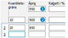 Rabatt. Pris före kvantitet kommer att användas på kvantitetsraden om den saknar pris och enbart rabatter registreras. Detta innebär att om bara procentuella rabatter används, behöver bara rabattsatsen anges på varje rad. Priset i förhållande till angiven rabatt är alltså det priset som har registrerats före eventuella kvantiteter.