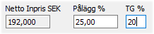 Om istället täckningsgraden används för nettoprissättning, kan fältet TG öppnas för inmatning. Inmatning föreslår då istället pålägget baserat på angiven täckningsgrad. |