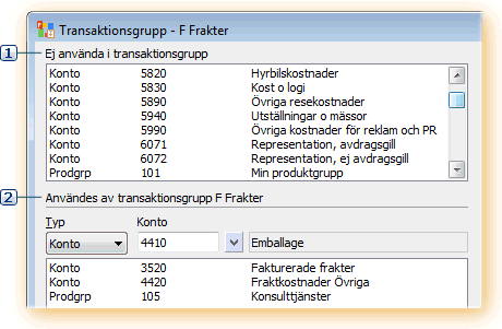 Genom att välja en rad i listan och därefter trycka F7 - Spara, kan kontot eller produktgruppen väljas in på den tidigare valda transaktionsgruppen. Raden kommer då att läggas till listan Användes av transaktionsgrupp.