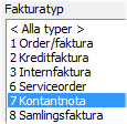 Normalt inkluderas fakturor i alla fakturatyper i fakturajournalen. Om man önskar att enbart skriva ut och kanske även integrera en viss typ (t.ex. kontantnotor), kan denna väljas i listan över registrerade ordertyper. I listan visas alla typer som har en Egen fakturanummerserie. Ordertyper som är registrerade med Gemensam fakturanummerserie kan inte separeras i fakturajournalen.