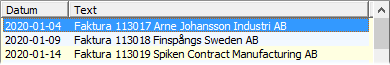 Raderna i listan visar om journalen gäller fakturor eller betalningar (eller inleveranser vid inleveransbokföring) samt vilket datumintervall som journalen avser. Dessutom visas även uppgifter om att journalen är integrerad med bokföringen (Ja/Nej) - och då även till vilket verifikationsnummer och serie. Man kan då lätt se om journal är integrerad innan den skrivs ut vid avstämning, och vilken verifikation den tillhör.