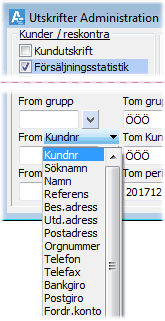 Notera att om urvalet är flera perioder vid utskrift till till bildskärm / skrivare, kommer summering av ackumulerat per kund enbart att göras på de perioder som visas i rapporten, d.v.s. normalt 12 perioder. Statistik som löper över flera år ska alltså alltid skrivas till fil (Excel), där alla kolumner kommer med.