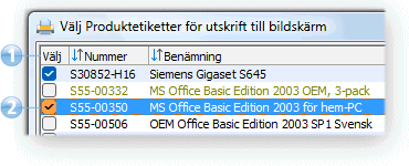 Bocka av en eller flera etiketter genom att klicka på raden för den aktuella etiketten. Genom att bocka av rader, exkluderas dessa etiketter från utskriften. Från början är alla rader i urvalet markerade för utskrift.