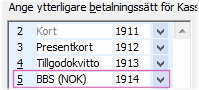 Funktionen Valutakonto vid kontering kan även användas vid kontant kassaförsäljning i utländsk valuta och då istället mot det konto som är angivet för det aktuella betalningssättet i kassan. |