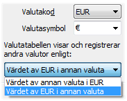 Notera att inställningarna Värdet av annan valuta i systemvalutan och Värdet av systemvalutan i annan valuta vid omvänd valutatabell inte påverkar den bakomliggande matematiken i systemet eller datalagringen i databasen. Detta till skillnad från de flesta andra inställningar som t.ex. inställningen för själva systemvalutan. Inställningen kan därför när som helst förändras efter en tids körning med t.ex. systemvalutan EUR.