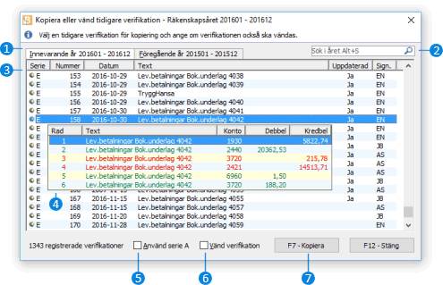 Funktionen används för att kopiera en tidigare registrerad verifikation till det aktuella räkenskapsåret. Genom även ange alternativet Vänd verifikation är det även möjligt att skapa en kopia av verifikationen, men med spegelvända konteringar. |