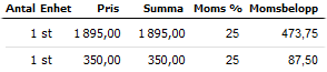 Momssats. Momssatsen för den momskod som används. Detta förutsatt att samma momssats används i hela ordern. Vid blandad moms skrivs ingen momssats i sidans fot.