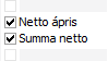 Summa netto visar Netto ápris multiplicerat med levererat antal. Summan skrivs med den noggrannhet som har ställts in i fältet Netto ápris med avseende på antal decimaler. |