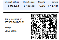 Fältet QR-kod betalning väljs i fakturans sidfot och designas med en lämplig läsbar storlek. Koden skrivs kvadratiskt baserat på den designade bredden och höjden. Oavsett hur stor koden är designad, är den skapad med hög upplösning vilket innebär att den kan förstoras med bra kvalitet t.ex. när fakturan skickas via PDF-formatet.