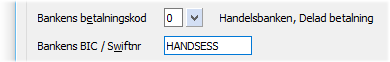 Den egna bankens BIC / Swiftnummer behövs vid bankgirobetalningar enligt ISO20022 och används då främst vid utlandsbetalningar. Genom att välja en betalningskod (och bank) i listan, kommer bankens BIC att föreslås automatiskt. Om en annan bank än de listade bankerna används, anges Bankens BIC / Swiftnummer manuellt.