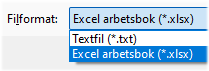Inställningen bestämmer att dialogen alltid ska föreslå att filen sparas i Excel-format. Denna inställning kommer från början att vara påslagen. Om man hellre önskar att filer allmänhet ska skapas som tabseparerade textfiler kan inställningen kopplas bort. |