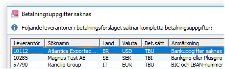 När betalningsförslaget är färdigställt och stängs utförs en kontroll av registrerade betalningsuppgifter på ingående leverantörer innan filen som skickas till banken skapas.