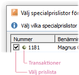 Knappen har en växlingsfunktion liksom kryssrutorna listan. När funktionen Välj inga har valts ändras funktionen till Välj alla för att istället kunna välja alla specialprislistor i listan och på detta sätt återgå till ursprungsläget.