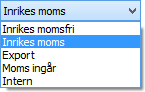 Normalt används kundens momskod som föreslås på varje ny order. Momskoden på ordern kan därefter vid behov ändras till en annan moms, från t.ex. Inrikes moms till Inrikes momsfri. Momskoden kan då t.ex. ändras till momsfri vid omvänd skattskyldighet i förekommande fall, när kunden normalt annars är momspliktig. |