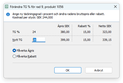 Som ett komplement till prissättning baserat på täckningsgrad, eller att förändra netto på hela ordern finns också möjlighet att förändra TG på den enskilda ordertransaktionen. Funktionen kan användas för ej prissatta varor, eller när pris eller rabatt ska justeras i det enskilda fallet. |