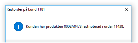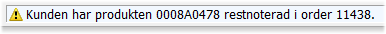 I de fall kunden är märkt för restorder kommer en varning att visas i statusraden om produkten som registreras finns i en tidigare restnoterad order till kunden. Detta för att undvika att kunden beställer varan igen när den har blivit restnoterad.