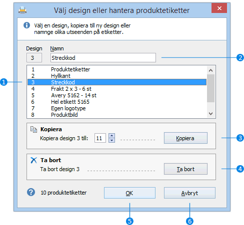 Som ett komplement till att bläddra fram en känd design genom att ange numret, kan istället knappen Välj design eller hantera etiketter användas. Dialogen kommer då att visa designens namn för att underlätta valet när många olika utseende användes på etiketterna. Utöver att välja en design erbjuder dialogen även möjlighet att kopiera till ny design, ändra namn på design eller ta bort design som inte längre används.