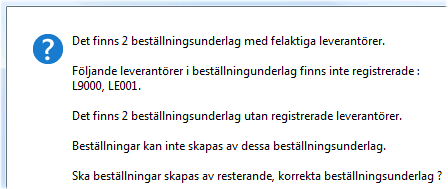 I vissa sammanhang finns det inte leverantörer eller felaktiga, ej befintliga leverantörer på transaktionerna, t.ex. när ett större antal transaktioner skapas från Utskrifter Administration - Beställningsförslag. Vid Skapa beställningar till alla leverantörer ges meddelande om detta, samt möjlighet att hoppa över dessa transaktioner för eventuell senare bearbetning eller borttagning.