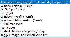 Följande format stöds av Winbas när bilder användes, t.ex. vid val av logotype i huvudmenyer eller vid design av blanketter.