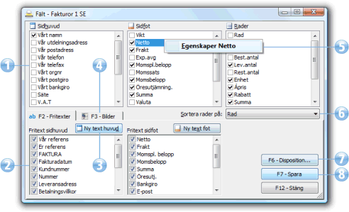 Högerklick på ett fast fält eller fritext ger möjlighet att förändra Egenskaper för fältet. Egenskaperna varierar beroende på vilken typ av fält som avses, och kan t.ex. vara antal decimaler för ett decimaltal eller datumformat för datumfält.