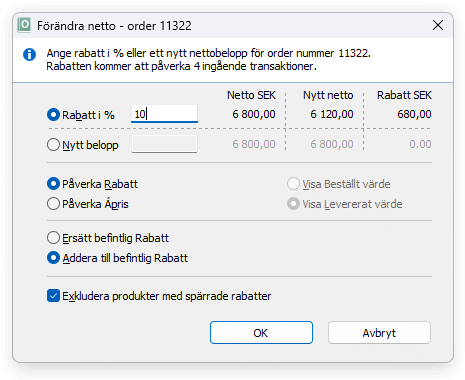 Man kan i detta läge välja att visa rabatten på baserat på antingen det beställda värdet eller det levererade värdet. Vid en procentuell förändring av rabatten blir resultatet alltid detsamma oavsett om rabattering sker mot beställt eller levererat värde. Dialogen kommer att visa det nya nettobeloppet och rabatten i kronor beroende på hur man valt att visa värdet på ordern.
