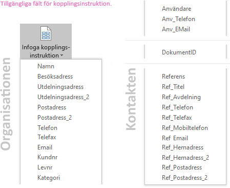 Använd alternativet Infoga kopplingsinstruktion för att lägga in fält från organisationer, kontakter och den inloggade användaren som ska kopplas till dokumentet.
