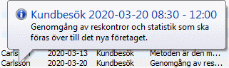 Genom att hålla muspekaren över en rad visas den fullständiga texten angiven i kommentaren för händelsen. Om man enbart ska titta på händelsen utan att göra förändringar behöver den alltså inte öppnas för att visa all text som kanske inte får plats i listan.