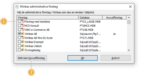 Välj vilka företag från Winbas som ska vara tillgängliga i Säljstöd genom att markera ett eller flera företag i listan. Företagen representerar databaser av formaten Access eller SQL Server.
