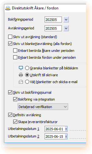 Avräkningsperiod föreslås från den avräkningsperiod som är angiven i Inställningar Transporter och avser den mer förkommande varianten Avräknas som är angivet på åkaren eller fordonet. Det är denna period som kommer att ligga till grund för utskrifter och rutiner specificerade nedan.