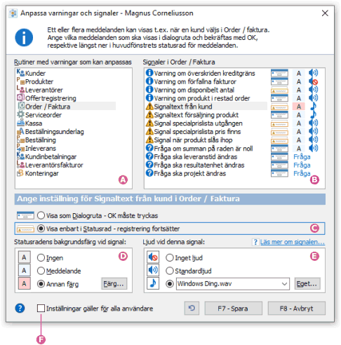 Som standard visas normalt varningar som dialogrutor med OK-knapp och signaltexter i statusraden.