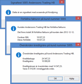 Alla som dialogrutor I följande exempel är alla varningar och signaler istället inställda som dialogruta och varje varning bekräftas med knappen OK eller tangenten Enter: Blandade varningar Flera varningar och signaler kan även visas som dels som dialogruta och dels som meddelande. T.ex. kanske varningen Förfallna fakturor visas i dialogruta och varningen Överskriden kreditgräns som meddelande i statusraden. |