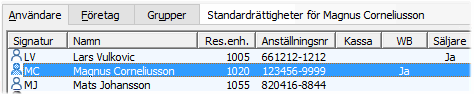 Vid registrering av ny användare eller när en befintlig användare väljs, visas alltid standard-rättigheter som standardvärde. Man behöver som tidigare nämnts inte använda rättigheter på företag, används inte fliken företag gäller alltid standardrättigheterna.