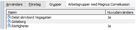 Genom att först välja en användare i listan över användare och sedan välja fliken Grupper, visas de arbetsgrupper som användaren ingår i.