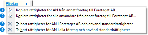 När specifika rättigheter används för enskilda företag, finns ytterligare verktyg för att underlätta underhållet av rättigheter för administratören. Genom att först välja en användare och ett företag i fliken Företag visas följande funktioner när alternativet Företag väljs, eller när man högerklickar på företaget i listan: