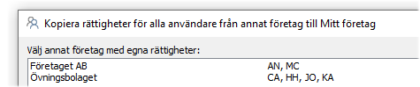 Listan i den efterföljande dialogen visar de företag som har egna specificerade rättigheter, samt signaturer för de användare som kommer att beröras av kopieringen. Rättigheter från det valda företaget kommer att sparas automatiskt på alla ingående användare.
