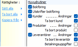 Användare kan ha varierande rättigheter till rutinerna i systemet. Antingen markeras de rutiner och utskrifter som användaren ska ha rättighet till eller också används knapparna <Sätt alla> eller <Sätt inga>. På detta sätt kan man t.ex. börja med att sätta alla rättigheter, och därefter avmarkera enstaka rättigheter för användaren.
